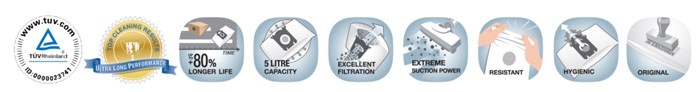 Avec sa contenance optimale de 5 litres, le sac aspirateur s-bag Ultra Long Performance a une durée d’utilisation jusqu’à 80% plus longue que celle d’un sac en papier traditionnel (d'après le constructeur) et la poussière est absorbée dans le sac sans boucher les pores, ce qui évite de perdre de la puissance d’aspiration.