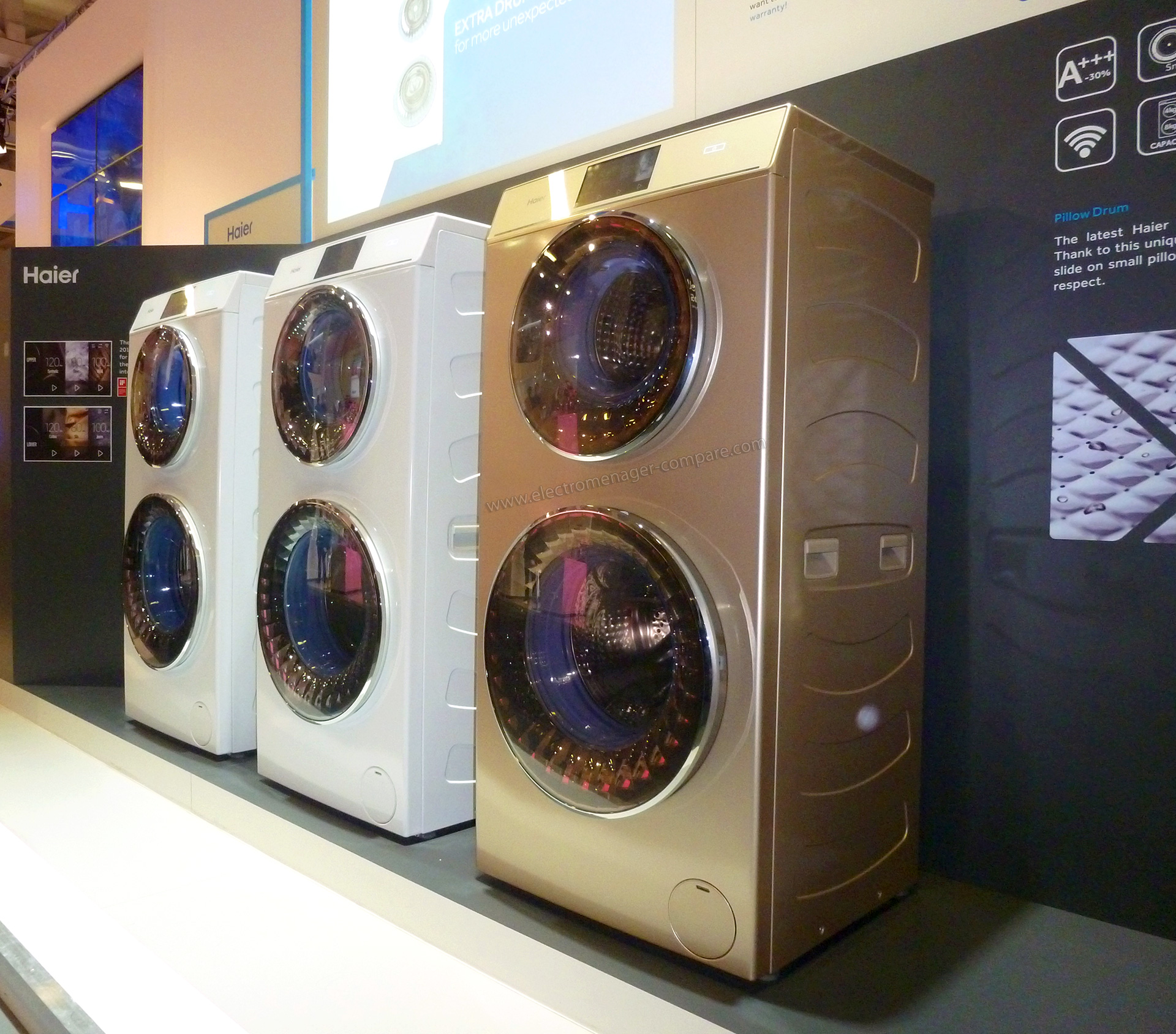 A l'occasion d'une conférence de presse préparant l'IFA 2015, Haier a levé le voile sur de nouveaux lave linge innovants, notamment le modèle Dual Drum qui embarque deux tambours capables de fonctionner simultanément. Ce modèle permettra par exemple de laver simultanément mais séparément le linge de couleur et le linge blanc, afin de préserver au mieux les vêtements tout en gagnant du temps. Ce modèle dispose par ailleurs d'un grand écran couleur facilitant l'utilisation. Un nouveau modèle INTELIUS 2.0 pourrait également être présenté durant l'IFA 2015, équipé d'un tambour proposant une capacité plus importante (36 cm de large).