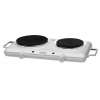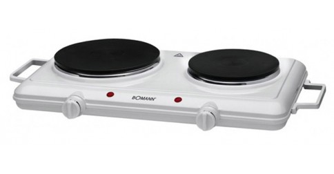 Appareil : table de cuisson BOMANN DKP 5028 CB Mode d'installation : pose libre Commandes : manettes mécaniques frontales (thermostats réglables Nombre de foyers : 2 électriques Puissance totale : 2500 W Alimentation : 230 V / 50 Hz / 10 A Couleur : blanc