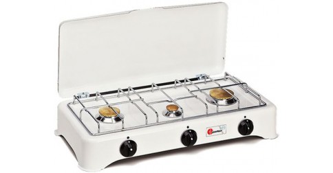Appareil : réchaud PARKER 5327c Mode d’installation : pose libre Commandes : manettes mécaniques frontales Nombre de foyers : 3 à gaz Supports : 1 grille double ou plus en acier chromé Chapeau de brûleur : en laiton massif Dimensions L x P x H (mm) : 585 x 275 x 125 Matériau de la surface : émail Couleur : blanc